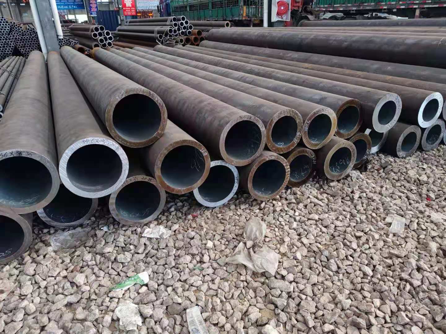 厚壁无缝管,大口径厚壁无缝钢管: 大口径厚壁无缝管的原料是圆管坯,:钢坯被送入熔炉内加热,温度大约为 1200 摄氏度。燃料为氢气或乙炔。炉内温度控制是关键性的问题,圆管坯出炉后要经过压力穿孔机进行穿空,一般较常见的穿孔机是锥形辊穿孔机。穿孔后,圆管坯就先后被三辊斜轧、连轧或挤压。挤压后要脱管定径。定径机通过锥形钻头高速旋转入钢胚打孔,形成厚壁无缝钢管。厚壁无缝管内径由定径机钻头的外径长度来确定。圆钢钻孔工艺,可定做大口径超厚壁无缝管,外径∮600-15000、内孔200-12000、长度7米各种材质无缝钢管。